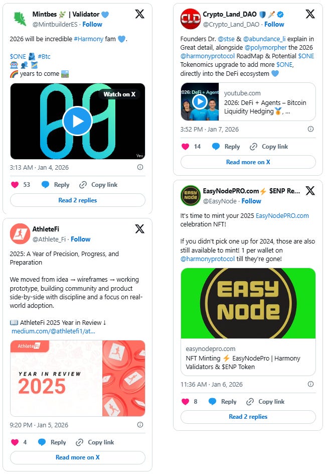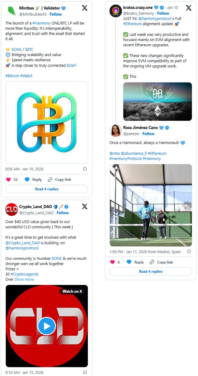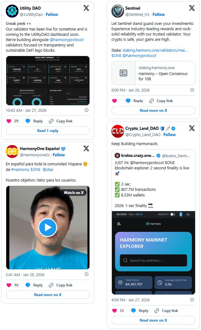 Community: Validators continued to improve network tooling, sharing updates on new dashboards and staking services. @HarmonyoneEs translated content to further the reach of 2026 roadmap updates. The community celebrated recent explorer data that confirmed protocol improvements have maintained consistent two-second block times.