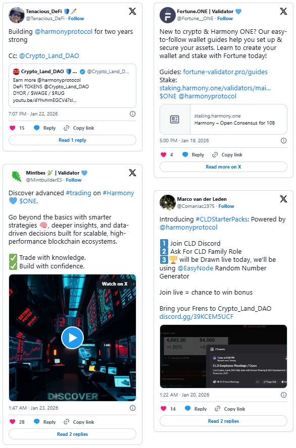 This month showcased the strength and initiative of the Harmony community. From deep-dive discussions on the 2026 roadmap to the release of staking and onboarding guides and validator-led initiatives. Our community has been instrumental in driving the network forward. With new outreach, active DAO programs, and the deployment of new validator dashboards, the ecosystem continues to grow more accessible through collective effort.