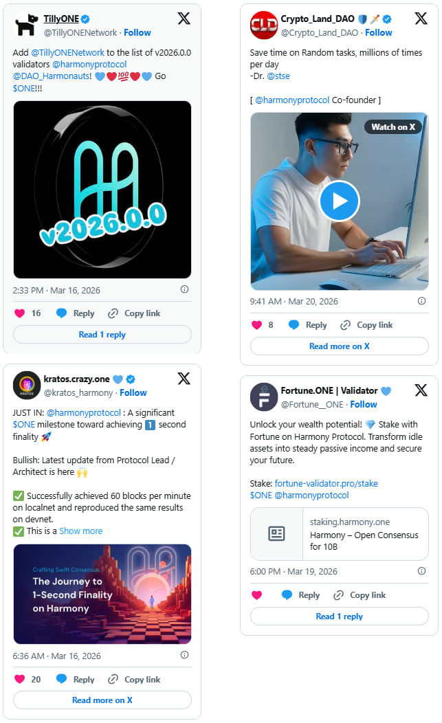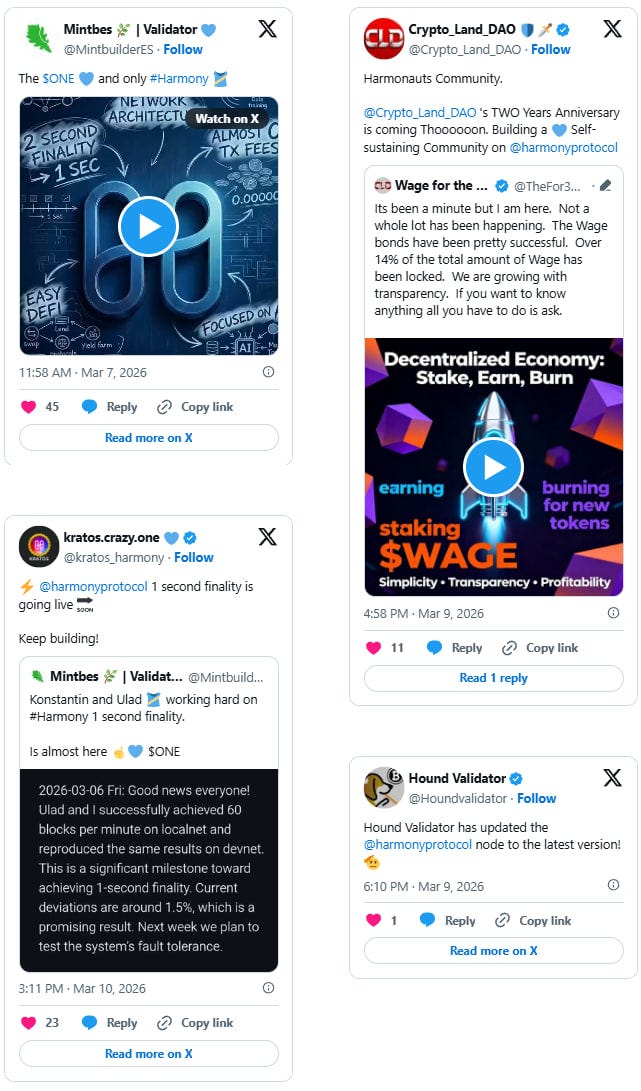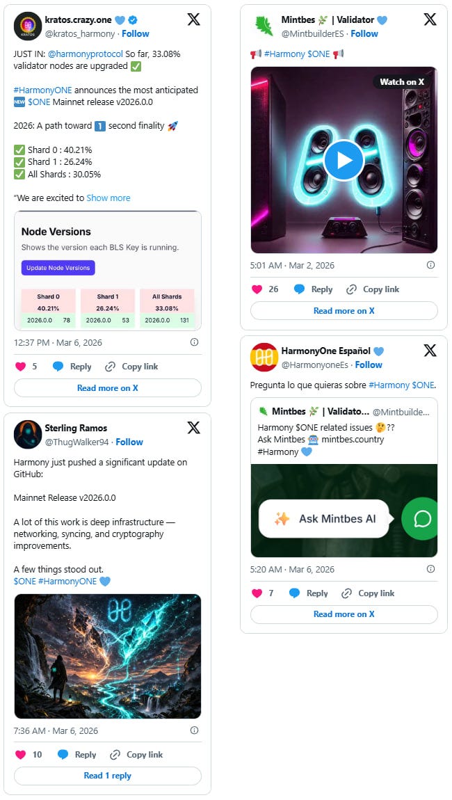 The community rallied around the v2026.0.0 mainnet release, with validators upgrading across both shards and ecosystem accounts amplifying progress on one-second finality. Validators continued weekly staking outreach and onboarding support, while ecosystem projects like AthleteFi and Wage for the Future shared their own milestones building on Harmony.