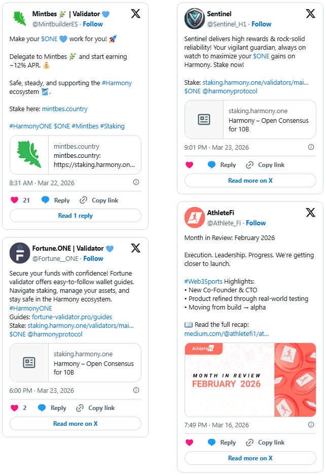 Mintbes promoted delegation with approximately 12% annual returns and encouraged steady support of the Harmony ecosystem. Sentinel and Fortune.ONE both highlighted staking rewards and shared wallet guides for managing assets on Harmony. AthleteFi published their February month in review, noting a new co-founder and CTO, product refinement through real-world testing, and a move from build to alpha.
